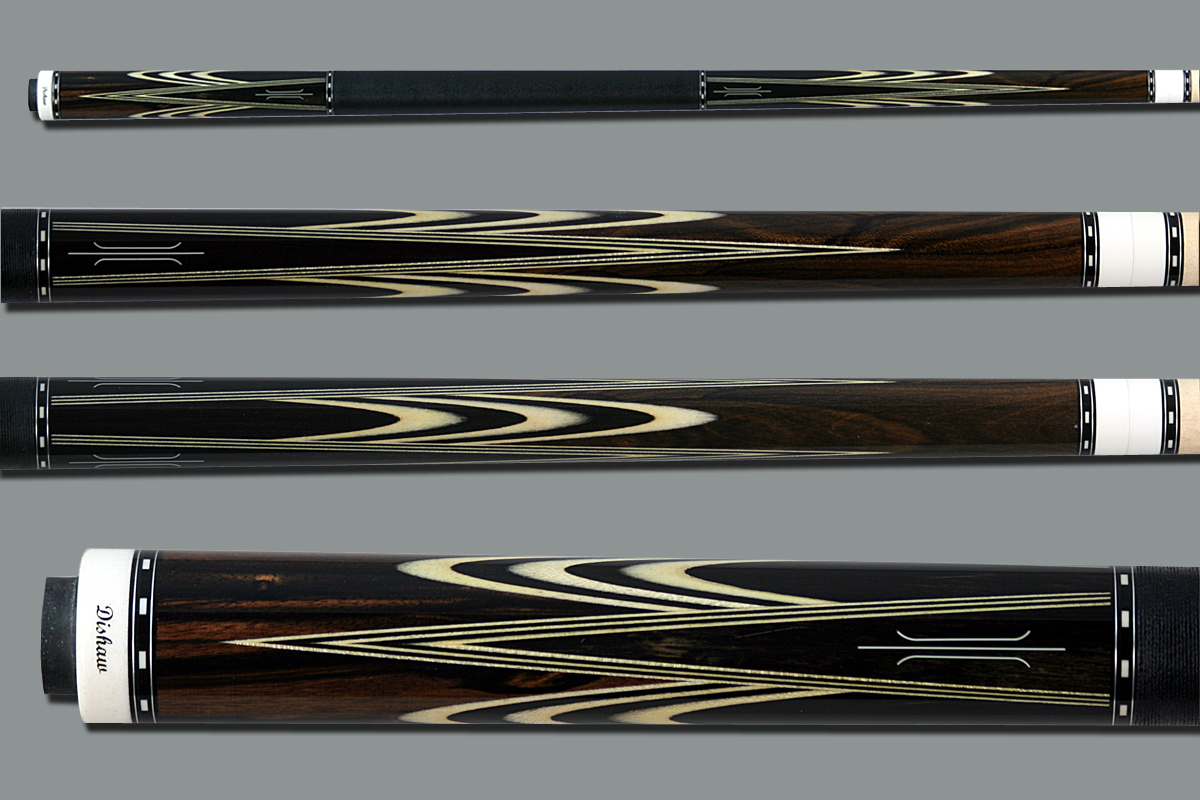 $2,499 Highly figured zircoti forearm and butt sleeve. Three long V grove ebony points with wht/blk/wht/blk/wht veneers. Three short butterfly points with same veneers. 5 sets of gold colored ring sections, art deco inlays in long points. Black linen wrap. Two shafts and joints protectors included. | |