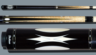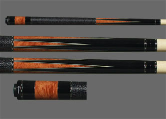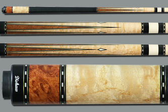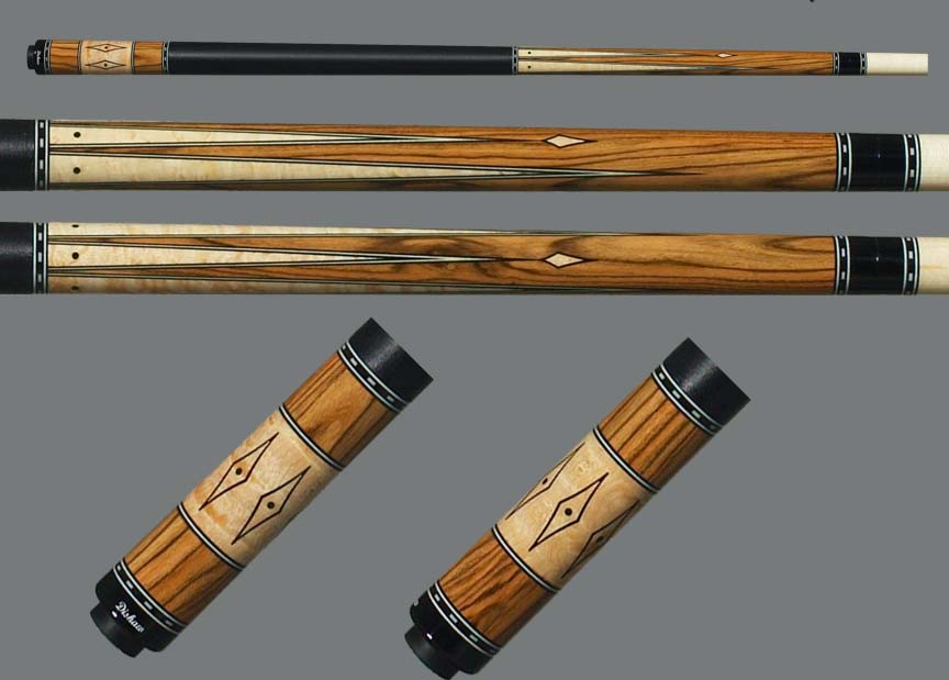 $1,499...SOLD Highly figured Ziricoti forearm. Three long and three short birds eye points with maple inlays at the tips of the short points. Five sets of ring sections. Six diamond inlays in the butt sleeve that features a combination of Ziricoti and Ebony. Two shafts with joint protectors and black irish linen wrap. |