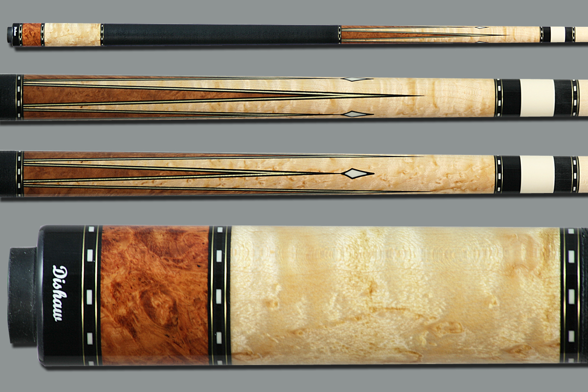 $1,399..SOLD The forearm is highly figured birds eye maple and butt sleeve. Three long, three short Amboynia burl points with blk/wht/blk veneers. Ivory Alternative inlays at the tip of the short points. 6 sets of ring sections. Th Burl amd maple butt sleeve. Black linen wrap, and joint protectors....