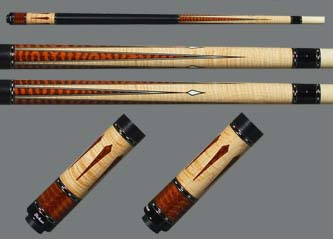 $1,699...SOLD The forearm is highly figured tiger maple. Three long, three short snake wood points with blk/wht/blk veneers. Ivory inlays at the tip of the short points. 6 sets of brass ring sections. Tiger maple and snake wood butt sleeve with 6 snake wood diamond inlays. Black linen wrap, two shafts and joint protectors. | |||||