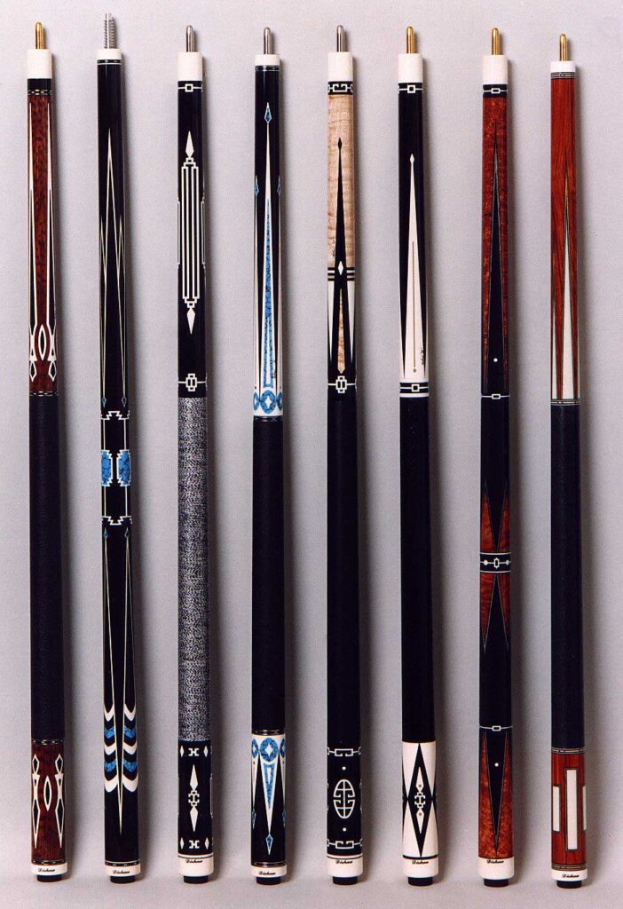 Desert Rose. …..Exotic African Amboynia Burl is the forearm of this design. The design of this cue features three long and three short points of ivory all surrounded with an ebony veneer and ivory inlays at each tip. Within all six points there are inlays of turquoise, ebony, and 14K gold. The butt sleeve consists of a solid piece of ivory with twelve pieces of turquoise, ebony and gold. Five sets of 14K gold and turquoise rings, leather wrap and ivory joint and butt cap complete this design.