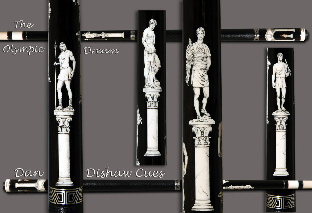 Six long Ebony points w/ holly borders. Reverse points design with Black Linen. 12 Abalone diamond inlays bordered in holy. 5 sets of gold color rings, two shafts and joint protectors. This cue designed for the The World Classic in TX.